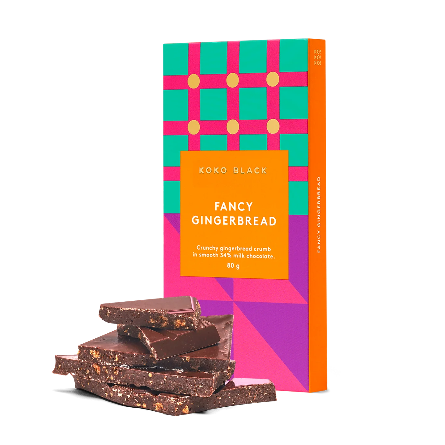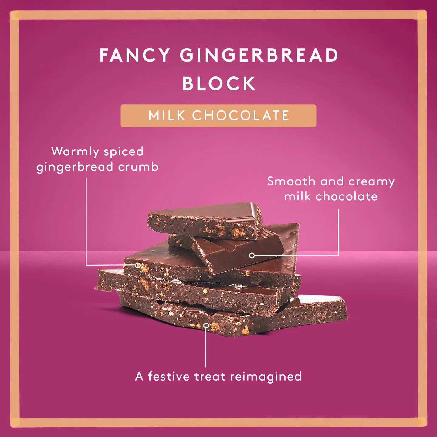 Ingredients: Milk Chocolate (Sugar, Cocoa Butter, Whole MilkPowder, Cocoa Mass, Emulsifier [Soya Lecithin], Natural Vanilla), Wheat Flour, Sugar, Molasses, Eggs, Ginger (0.5%), Cinnamon, Baking Powder, Sodium Bicarbonate, Butter (Pasteurised Cream [From Milk], Water), Sea Salt, All Spice.