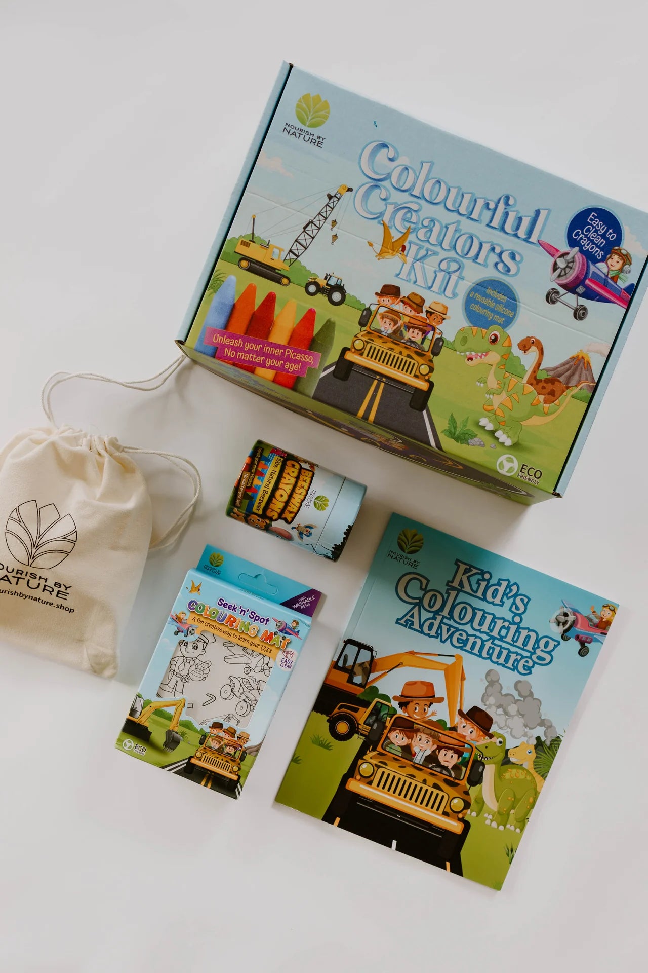 Inspire creativity and imaginative play with the Kids Colourful Adventure set — an all-in-one activity pack designed for curious minds and busy hands. Featuring a bold adventure-themed colouring book, our signature eco-friendly beeswax crayons, and a reusable silicone mat with washable markers, this set is perfect for home, travel, or gift-giving.