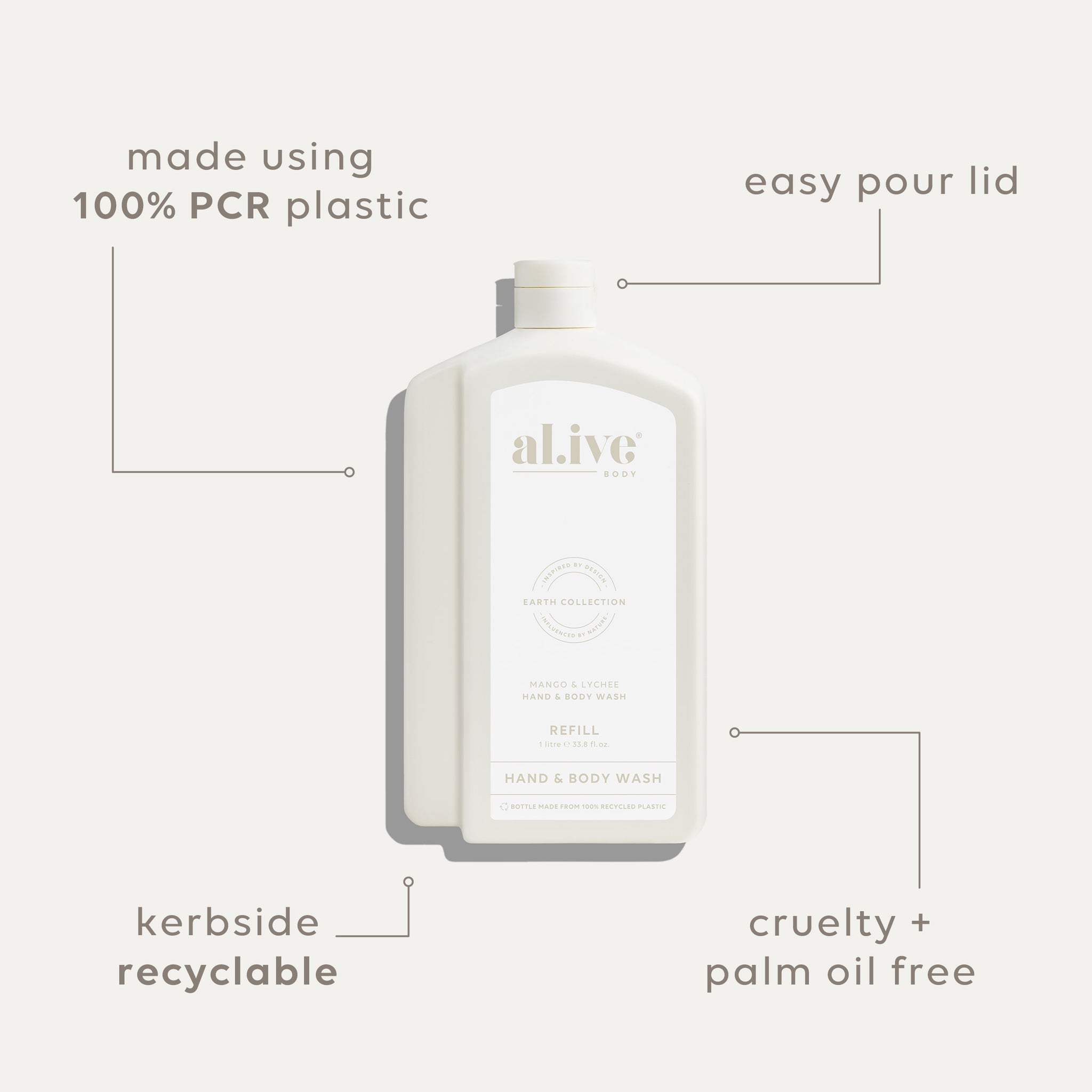 Each refill is designed to refill the 500ml al.ive body Hand & Body Wash bottle twice. With a controlled-flow spout for mess-free pouring, compact shape for easy storage, and full kerbside recyclability, it offers a practical, premium solution while extending the life of the product you already love.